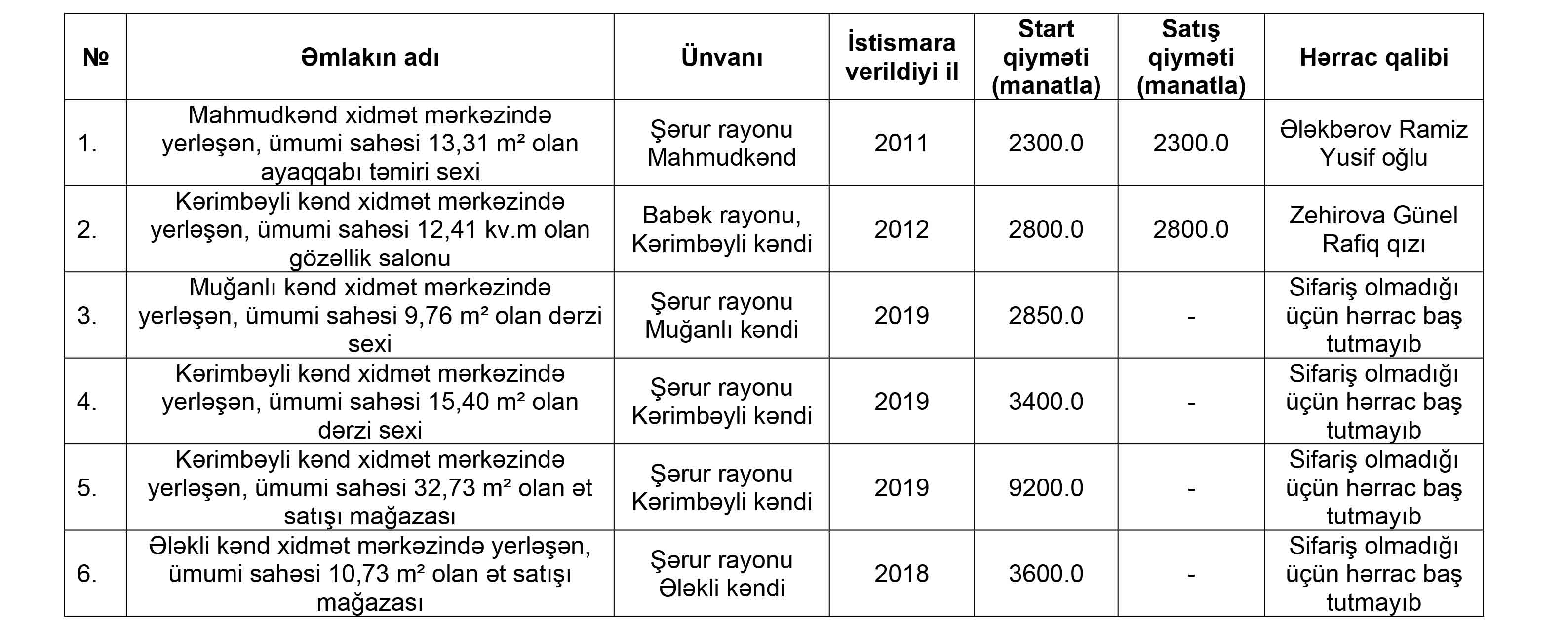 Naxçıvan Muxtar Respublikasının İqtisadiyyat Nazirliyi yanında Əmlak Məsələləri Dövlət Xidmətinin tabeliyində “Hərracların Təşkili Mərkəzi” publik hüquqi şəxs tərəfindən qeyri-yaşayış sahələrinin özəlləşdirilməsi üzrə 29 sentyabr 2025-ci il tarixdə keçirilmiş hərracın nəticələri