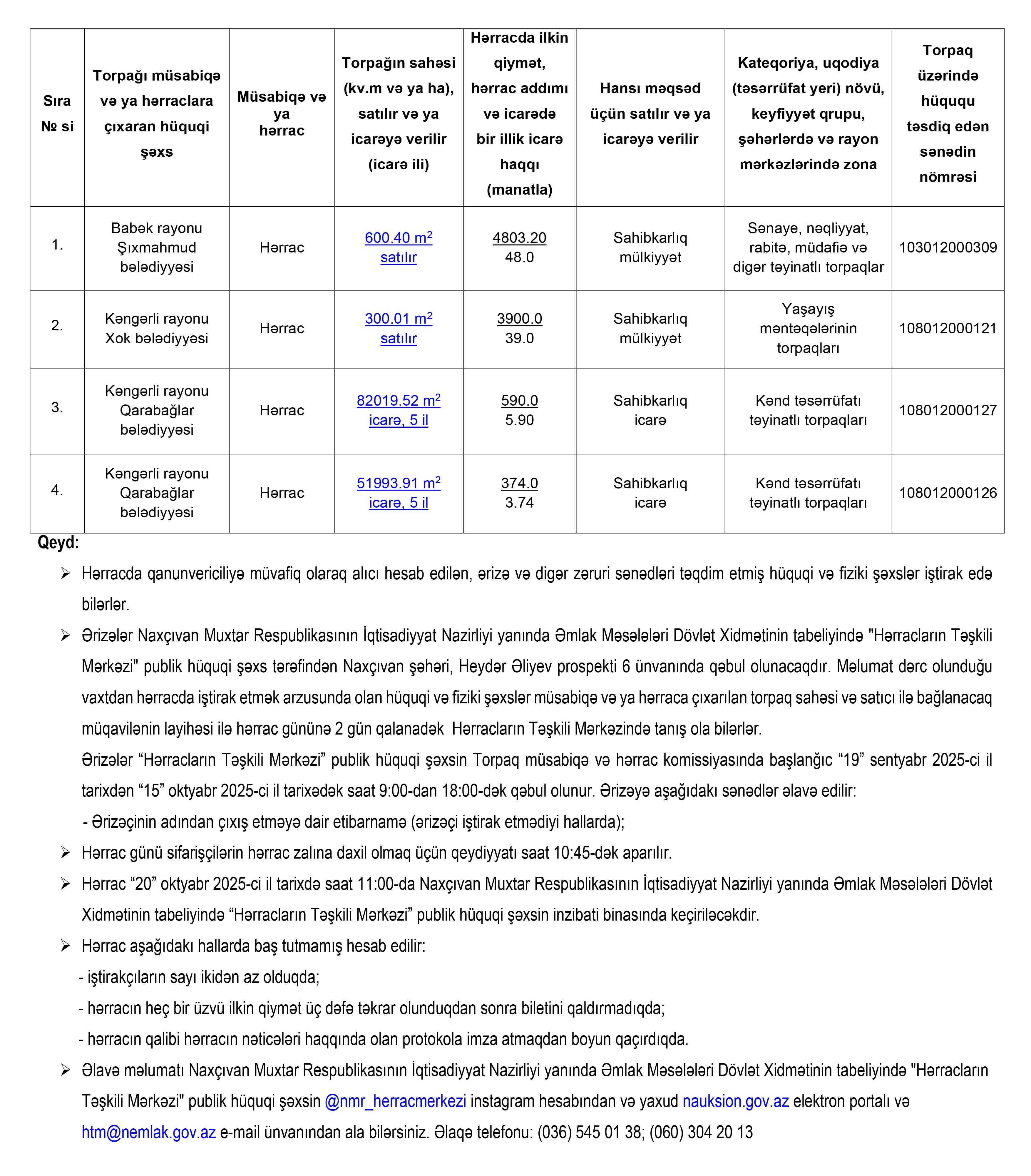 Naxçıvan Muxtar Respublikasının İqtisadiyyat Nazirliyi yanında Əmlak Məsələləri Dövlət Xidmətinin tabeliyində “Hərracların Təşkili Mərkəzi” publik hüquqi şəxs tərəfindən 20 oktyabr 2025-ci il tarixdə keçiriləcək torpaq hərracları haqqında məlumat